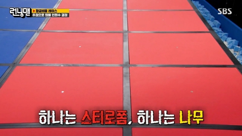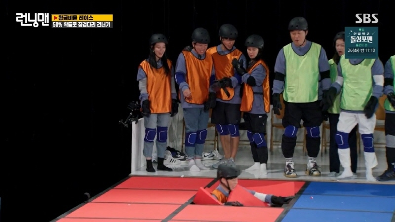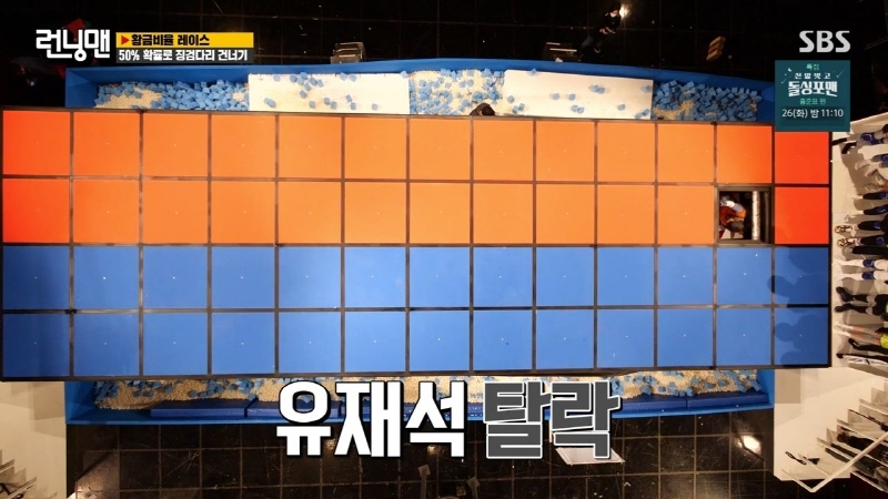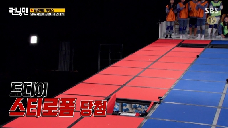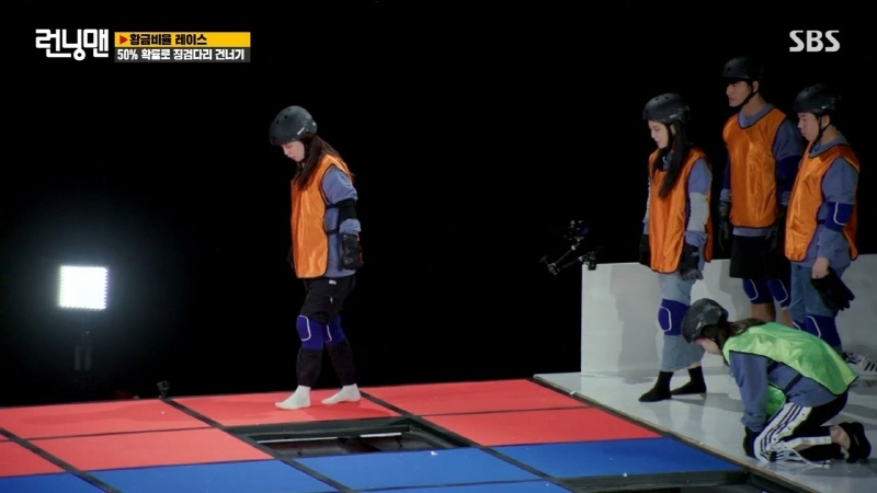 하나는 스티로폼, 하나는 나무로 된 두개의 발판을 골라 건너는 팀전 징검다리 게임 빠지면 이렇게 됨 유재석에 이어 송지효가 두번째 주자로 출발