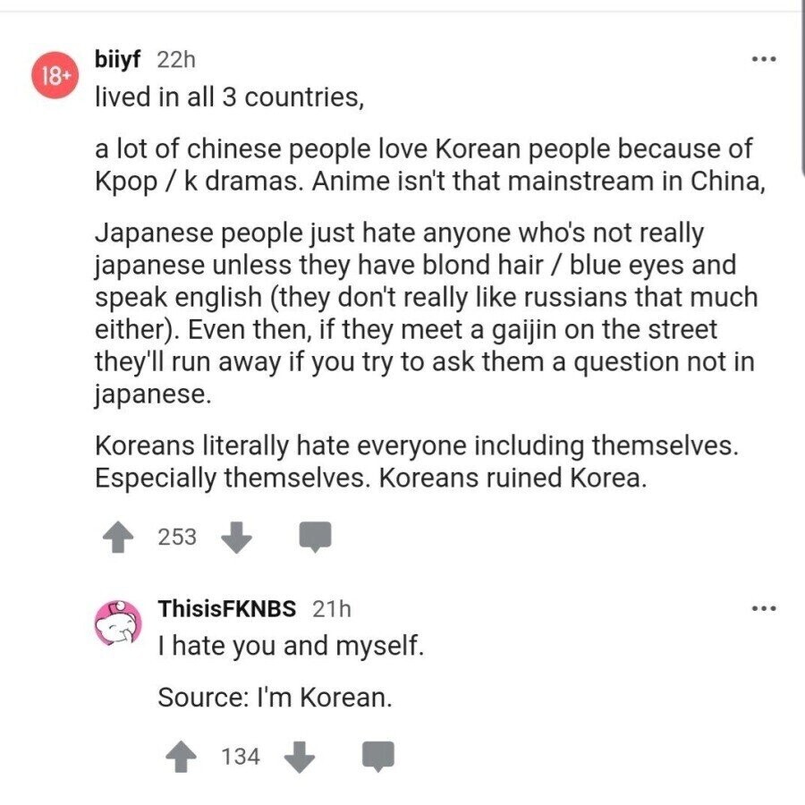 - 뭐라는거야 ㅈ같은 외국인새끼가. 누가 우리가 모두를 싫어한대? 너같은 새끼가 싫어!