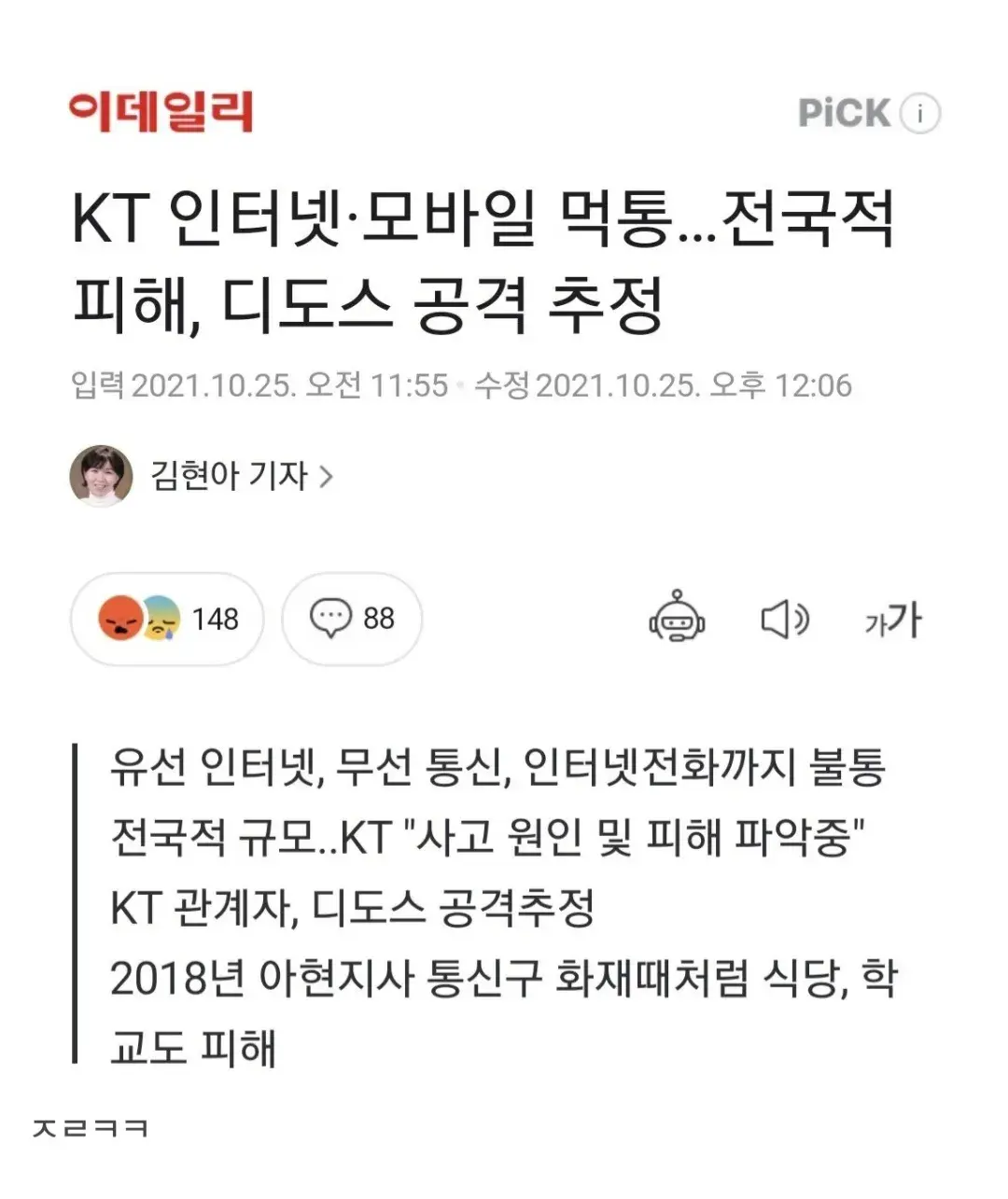 - ㅋㅋㅋㅋ 우리집 가족결합에 추가할인땜에 컴퓨터등등 다kt인데 동시에 전부 멈춰서 당황 40분정도 끊겼는데도 이리 불편하면 전쟁났을땐 어떨까 상상하게됨 ㅋㅋ 보상은해주려나 회사나 주식이런거 손해가엄청클듯