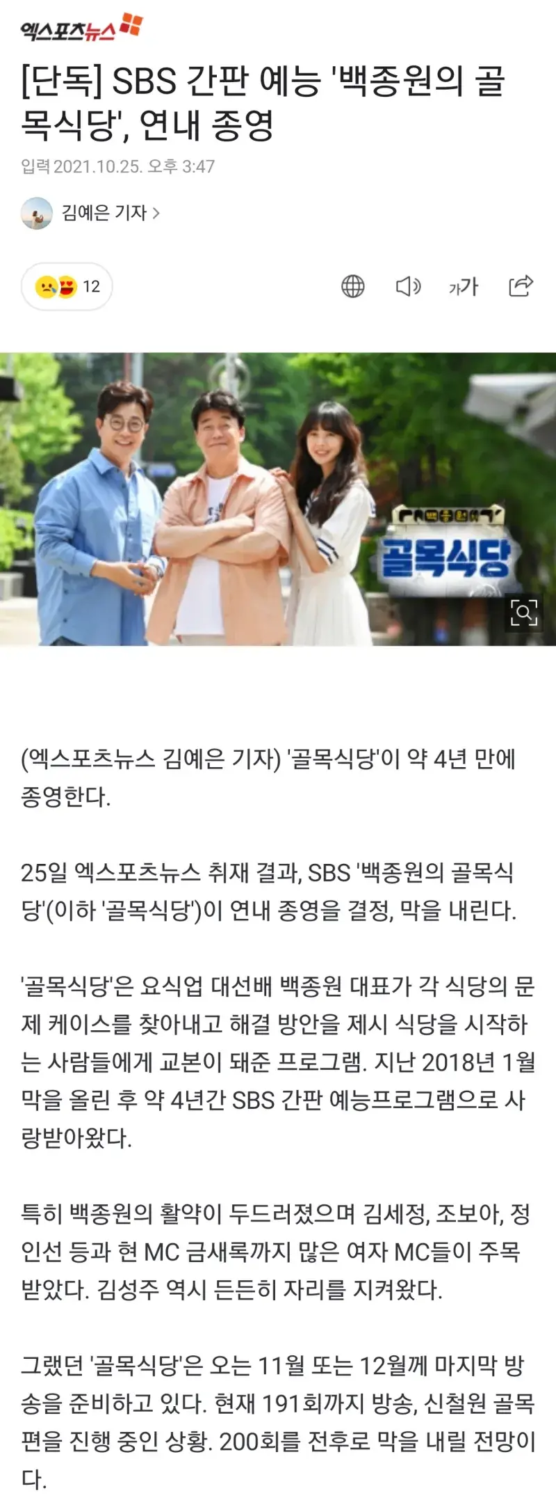 - 백종원이 솔루션해서 성공적으로 골목식당 마쳤던 가게 중에 절반이상이 폐업했다던..코로나때문이 크기도 하지만 이쯤이면 이제 더이상 의미가 없다고 생각했을지도..
