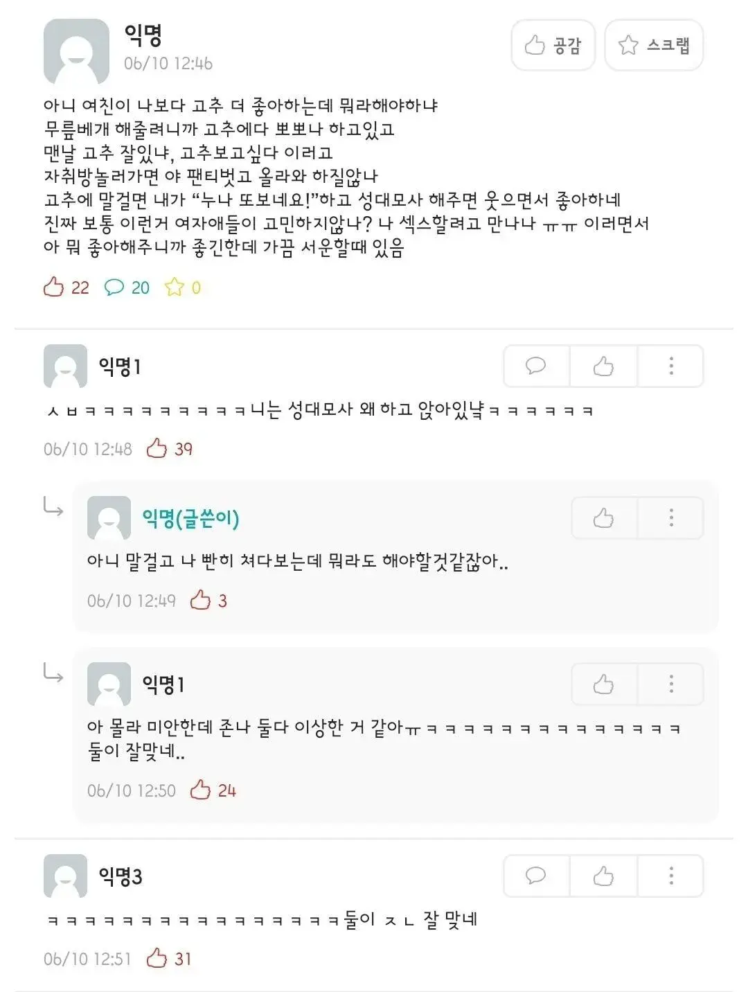 - 작성자는 못느낄지 모르겠지만 님 화법 은근 공격적임.