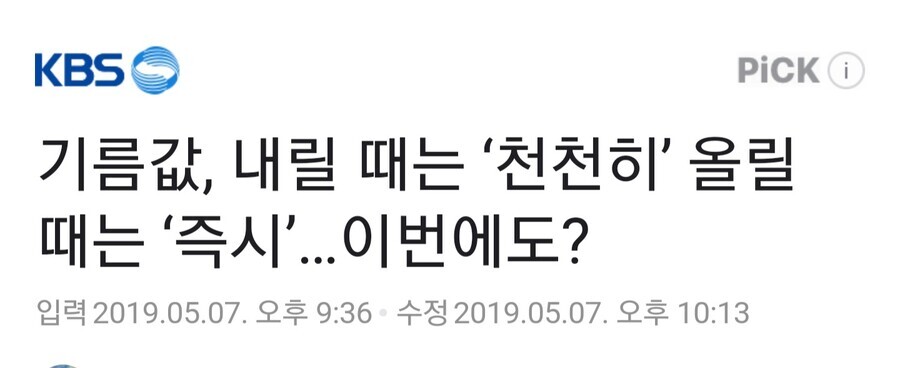 - 그니까 사올때 이미 비싸게 사왔으니 기름값 내려도 재고분은 사온 값 반영해서 아직 비싼건 이해한다 이거야 근데 기름값이 오르면 오히려 재고분은 싸게 사왔으니 마저 싸게 팔고 새로 산거만 올리는게 정상 아니냐? 내릴땐 이미 비싸게 사서 못내린다는 놈들이 왜 오를땐 텔레포트로 기름 떼온거 마냥 바로 올리냐고 ㅋㅋㅋ