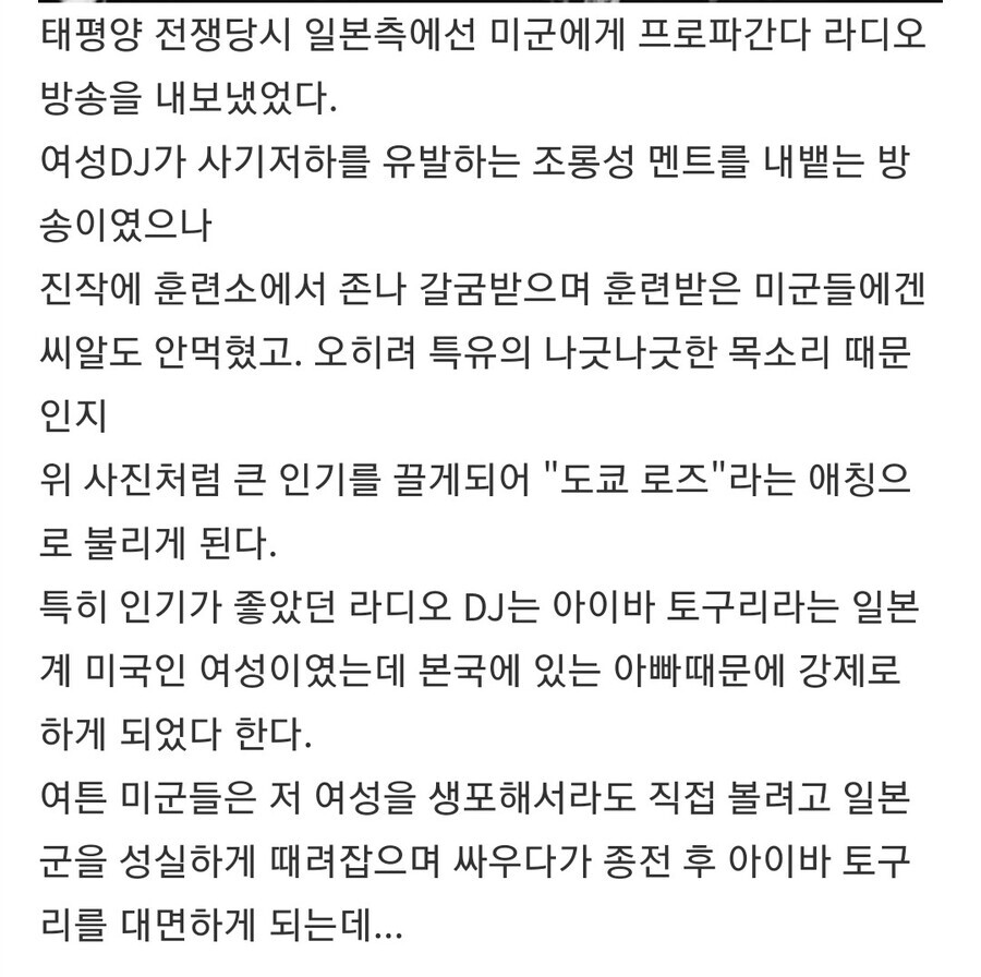 - 물론 도쿄로즈는 실제로 여러명이 했을거라 추측되고 저 사람도 도쿄로즈중 하나다, 관련업무 종사자일뿐이다 라는 이야기가 많음 다만 일단 일본인도 아니고 미국인인데 2차대전 언저리에 아빠가 강압으로 일본으로 오라 해서 기구한 인생을 살게된건 사실임