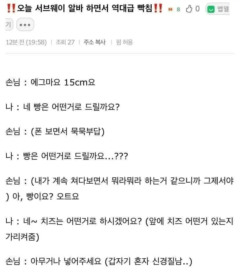 - 주문할 때는 좀 통화 잠깐 멈추거나 음악 스톱 좀 ㅠㅠㅠ 안 듣고 딴소리 하고 나서 왜 이거 주냐고 좀 하지 말고..