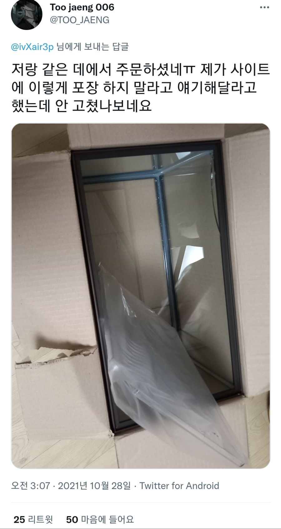 - ㅋㅋㅋ수조유리를 보호해야 한는데 수조 유리에 딱맞는 상자로 보내다니ㅋㅋㅋ 보통 위 아래로 스트로폼 두꺼운거 끼워서 공간만들고 하던데ㄷㄷ