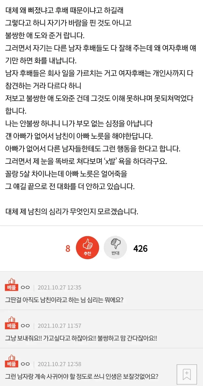 - 베댓들 시원하네ㅋㅋㅋ 저런걸 남친이라고 품고있는 여자도 제정신으론 안보임