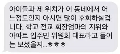 - 저만 섬뜩하다고 느끼나요? 보통 주민대표는 돈은 좀 어줍잖게있고 시간은 남아돌고 절대 주둥아리를 다물지않는 분들이 많이 하던데... 물론 케바케 사바사이지만 거기에 전교회장 자식을 만들려면 얼마나 쥐잡듯 잡고 쪼아댔을지... 그 성격으로 다른 사람 괴롭히기 시작하면 진짜 끔찍할거같아요