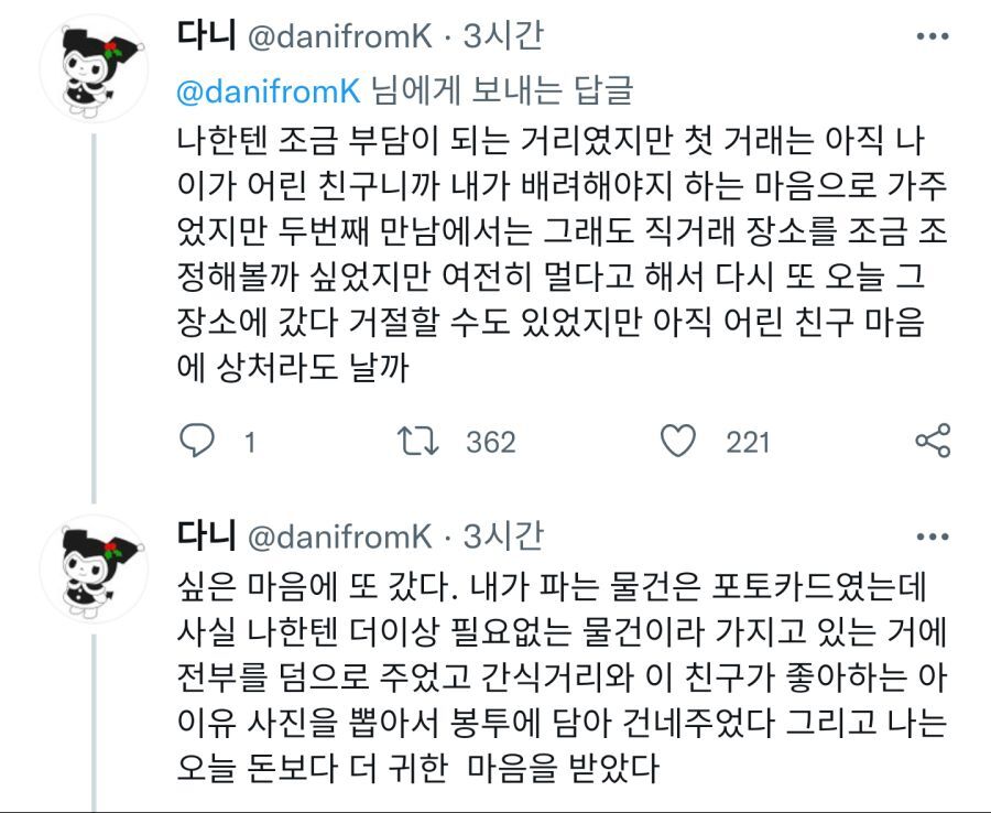 - 스벌.. 우리 동네는 살게요 몇시에 만나요 해놓고 약속시간 10분 지나서 죄송해요 내일 만나요 해놓고 내일도 안 나오는 잼민이들만 있더니...