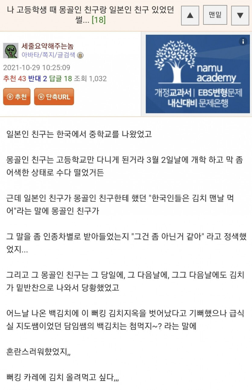 한국인은 매일 김치를 먹는다는 소리가 인종차별인지 알았던 몽골친구