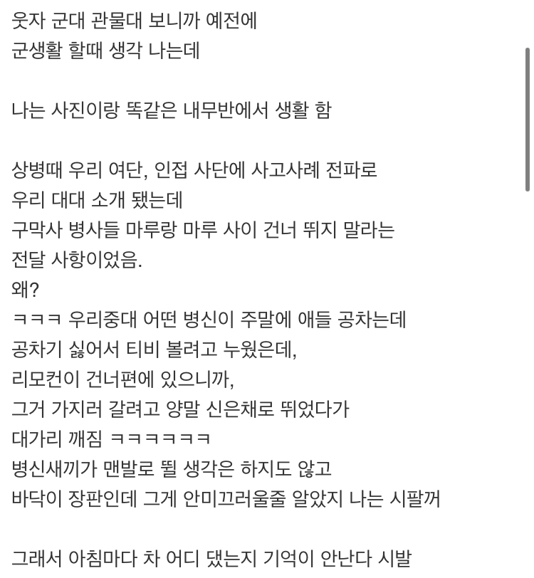 - 구막사에서 대가리 깨지는 애들 하도 많아서 간부들이 막사사이로 점프하는거 보면 진짜 죽일려고 난리도 아니지 ㅋㅋㅋㅋ
